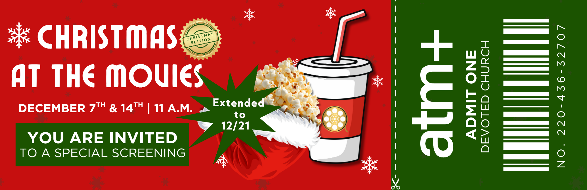 This December, join us at Devoted Church for Christmas at the Movies, where we bring your favorite Christmas films to life with powerful messages of hope, joy, and the love of Jesus. Enjoy creative storytelling, festive moments, popcorn and snacks, and an atmosphere the whole family will love. Come discover the meaning of Christmas in a fresh and inspiring way—you’re invited to come and see! Extended till December 21st.